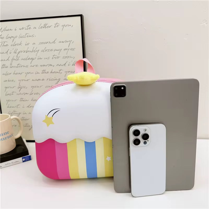 The Unicorn & Rainbow Backpack: A magical design with a unicorn horn (star), a vibrant rainbow stripe, and whimsical moon and stars to spark your child's imagination.