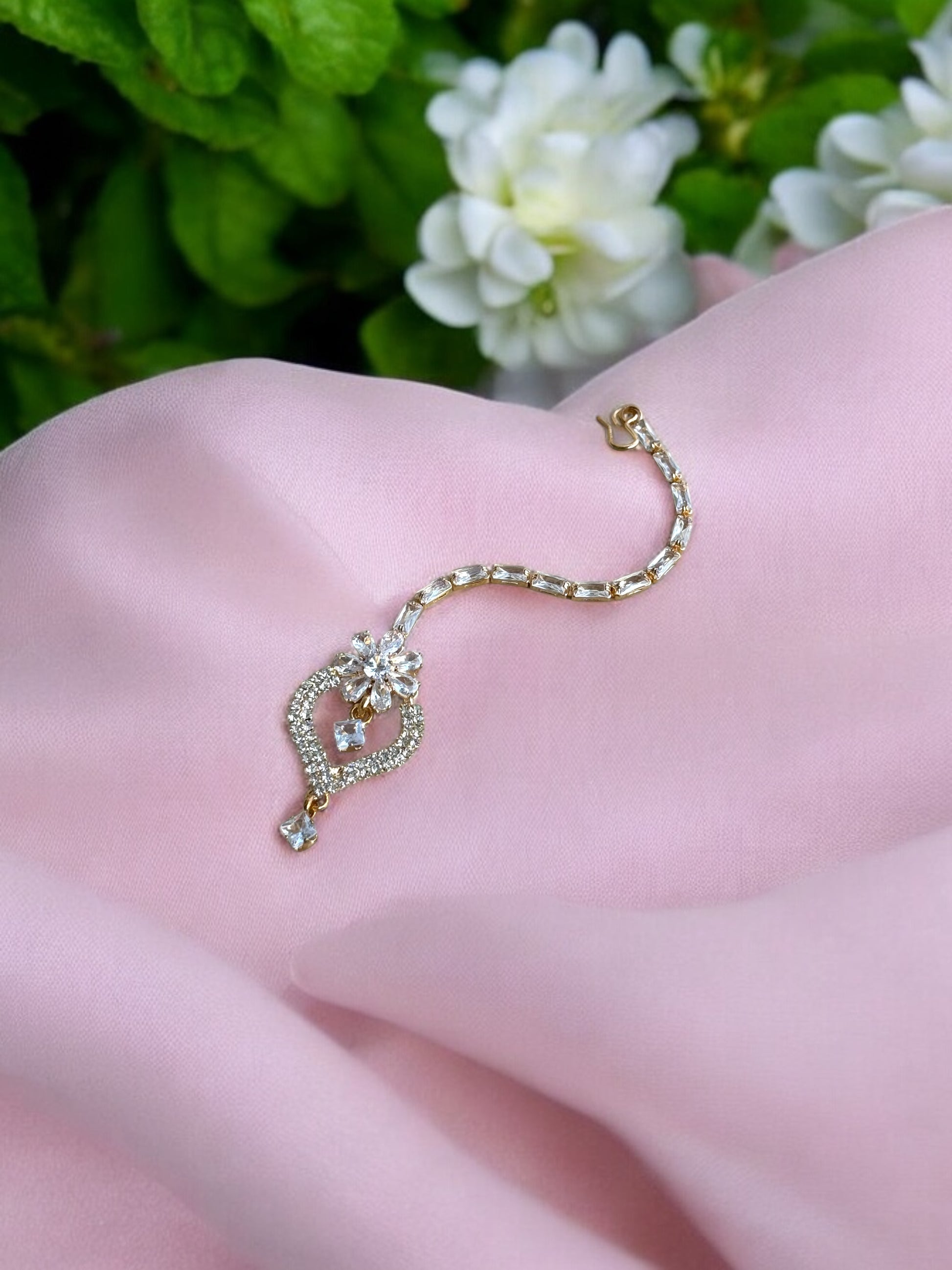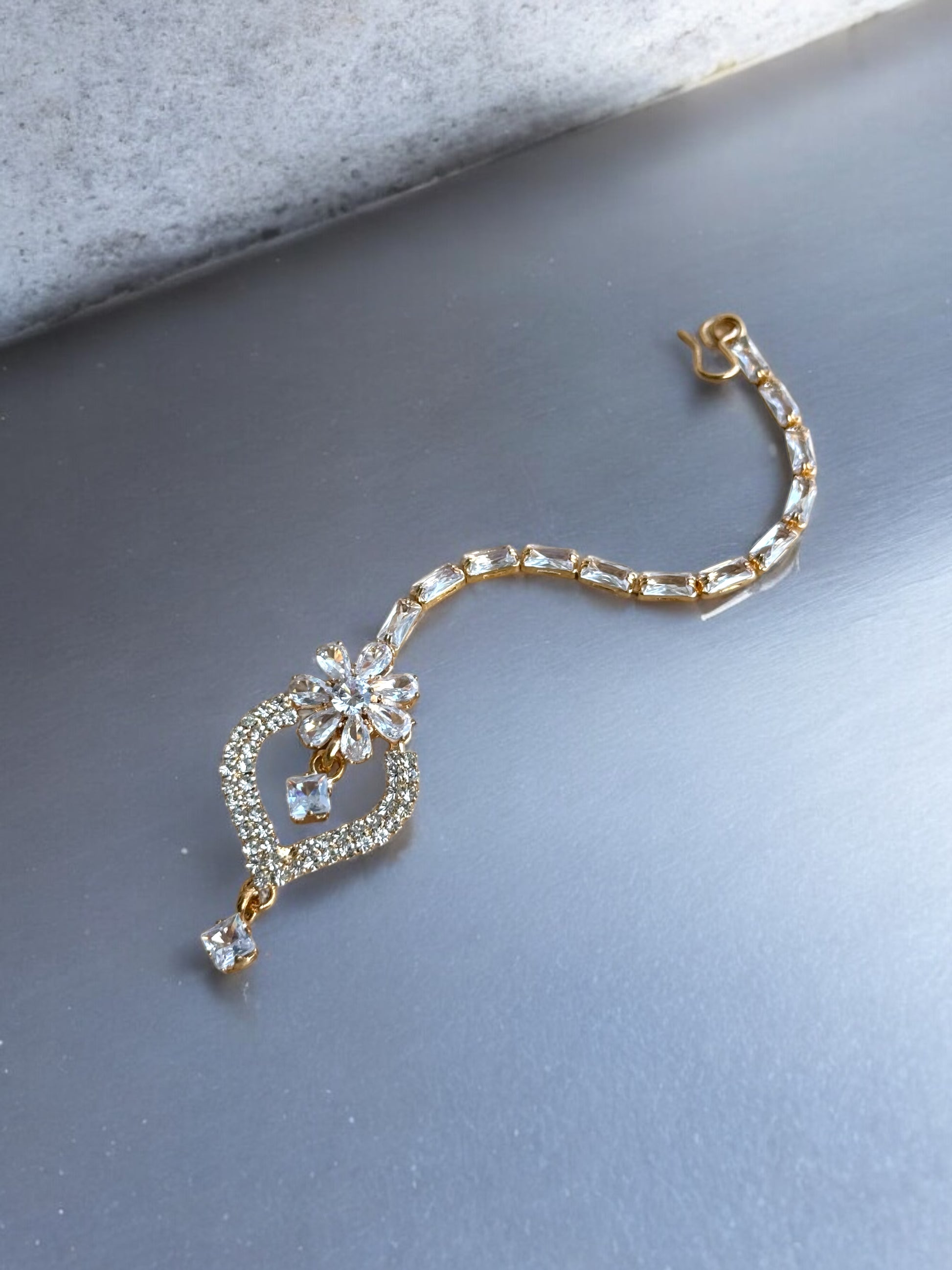 This exquisite Maang Tikka is designed with a delicate heart-shaped pendant, adding a touch of romance and elegance. The pendant is adorned with sparkling crystal accents, creating a dazzling and captivating look. The delicate chain adds a touch of sophistication and makes it perfect for special occasions or everyday wear. This Maang Tikka is a perfect gift for your loved one or a treat for yourself.