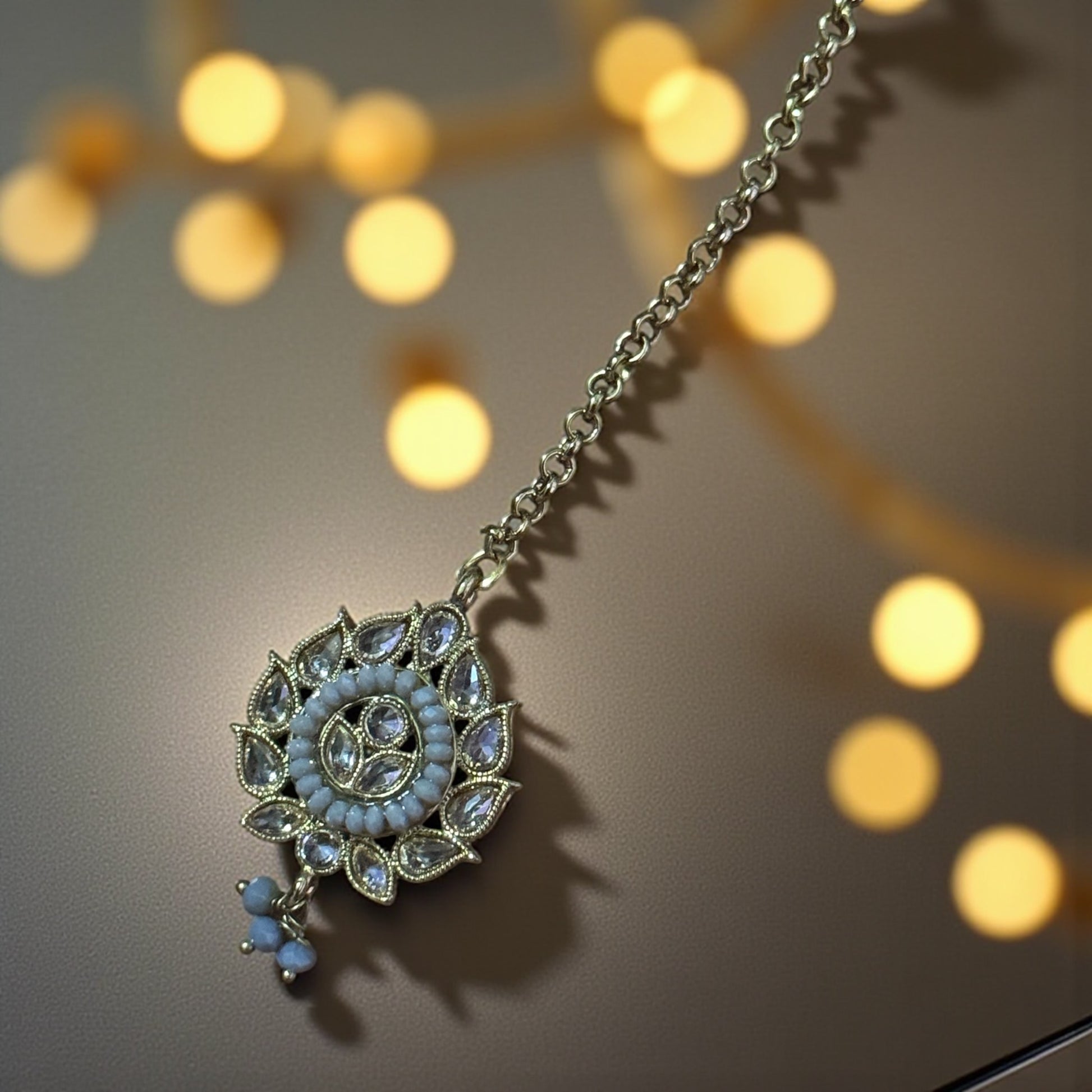 Add a touch of regal elegance to your traditional attire with the Divine Lotus Maang Tikka. This exquisite headpiece features a central pendant inspired by a blooming lotus flower, intricately detailed with sparkling faux Kundan stones and delicate grey beaded accents. The beautiful gold-toned chain ensures a graceful drape, perfectly framing the forehead. It's the ideal accessory for weddings, festive celebrations, and special occasions, providing a polished and opulent finish to your look.