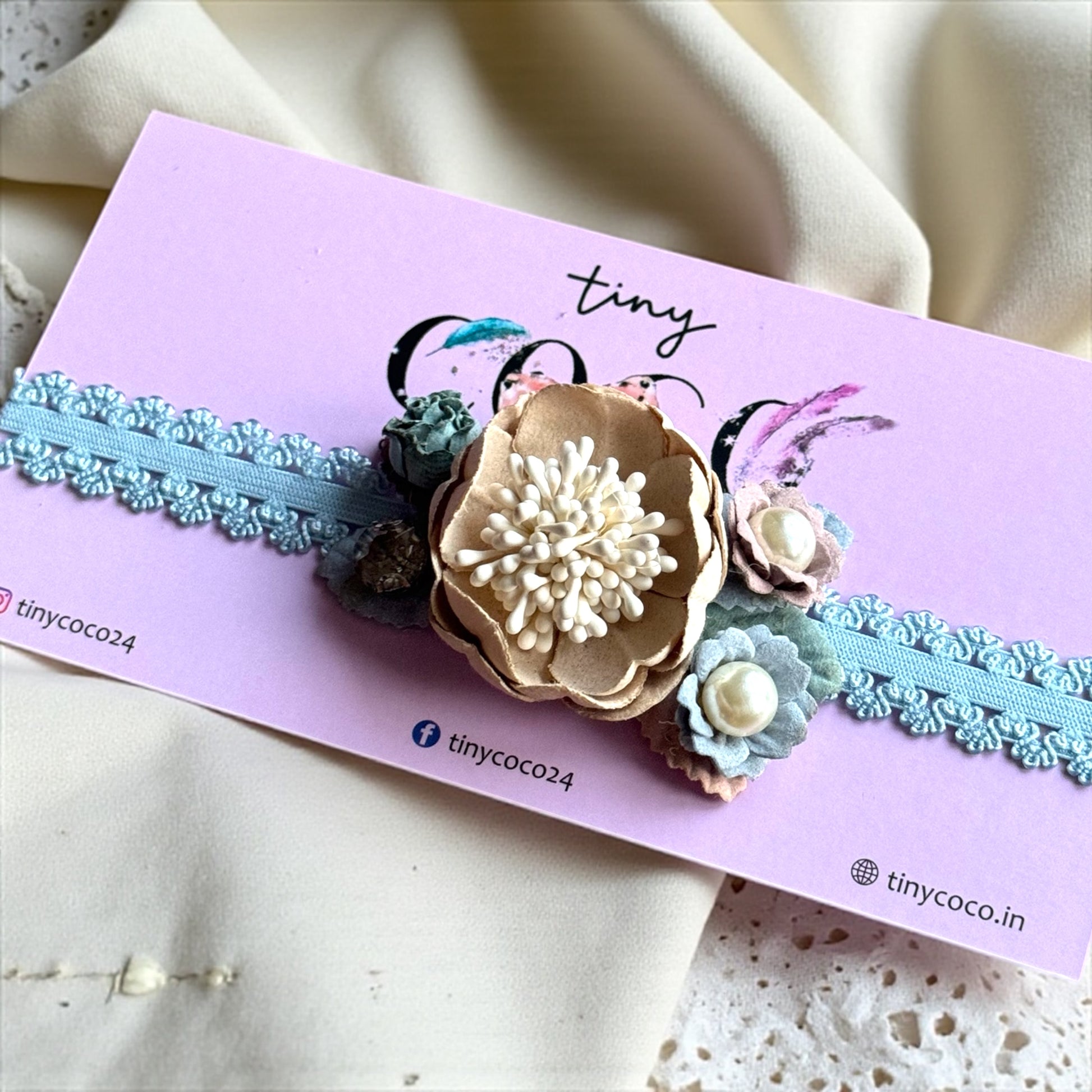 The Earthy Chic Floral Band offers a sophisticated, subtle accessory for infants and toddlers. It features a stunning central flower with a fluffy cream center, surrounded by complementary smaller blooms and pearls. The detailed floral arrangement is mounted on a comfortable, soft elastic band edged with delicate blue lace. This piece is designed for gentle wear and high style, ensuring your baby looks darling for every special occasion.