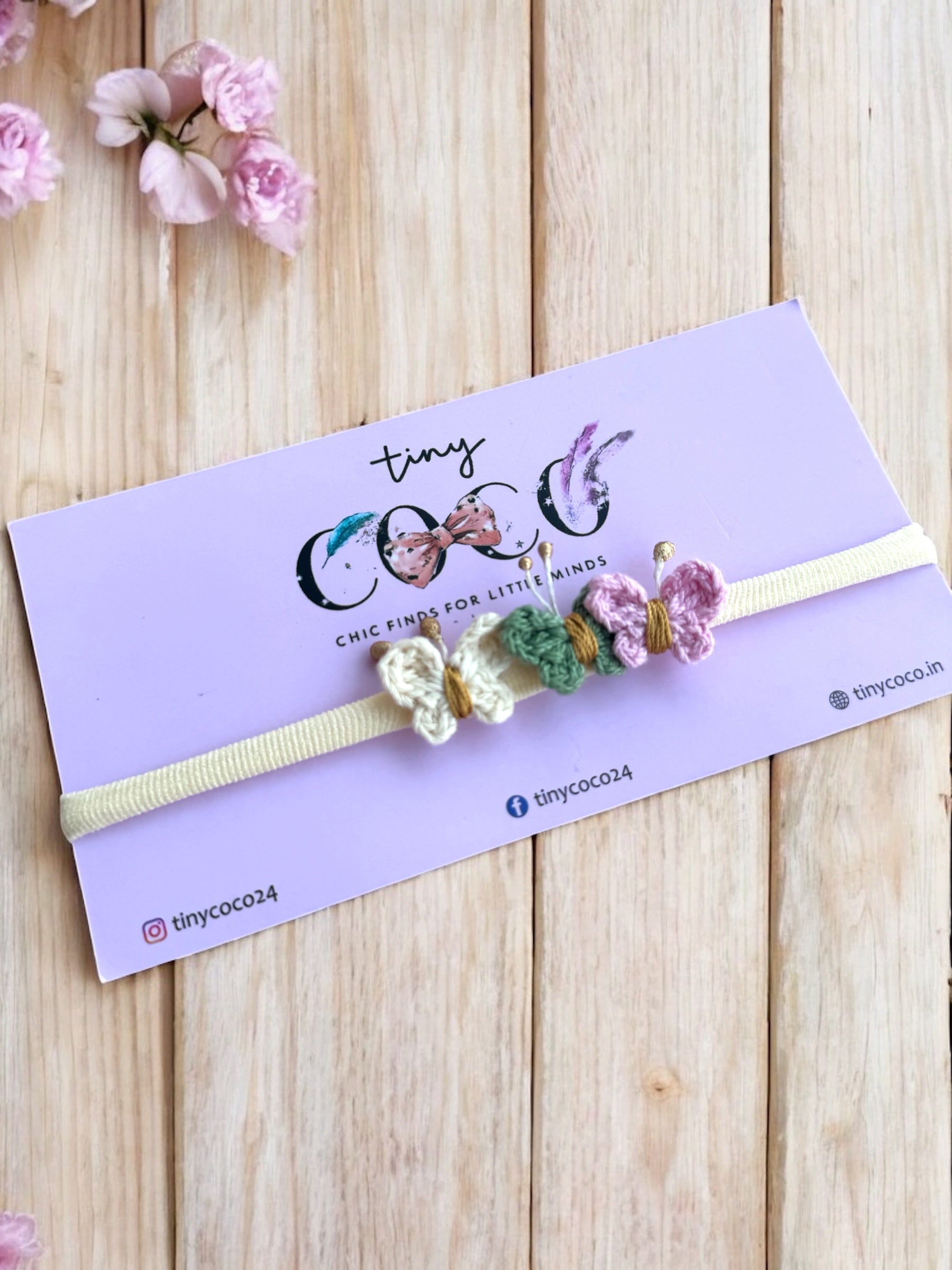 Let your little one's imagination soar with our delightful Fluttering Butterfly Trio Headband! This enchanting accessory features a whimsical row of three beautifully crafted butterflies, each meticulously crocheted or knitted in soft pastel hues – a gentle cream, a soft green, and a delicate lilac.
