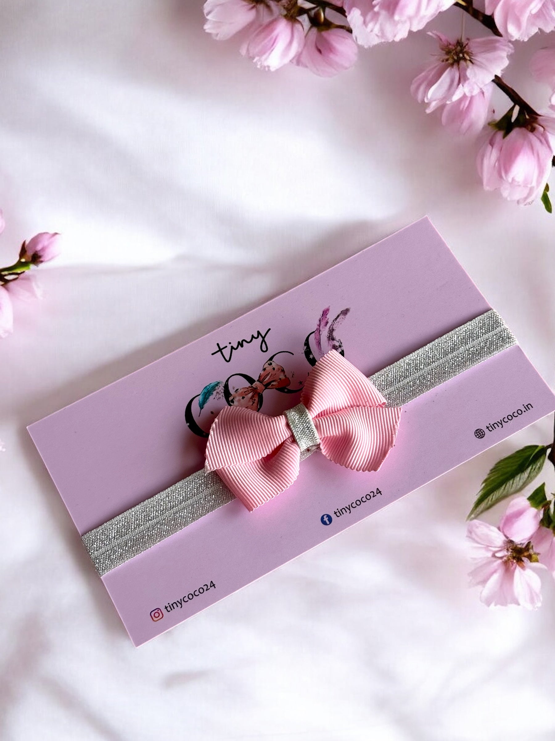 This beautiful headband features a classic, perfectly formed bow crafted from soft, delicate pink fabric, exuding a gentle and feminine appeal. What truly makes this bow stand out is its radiant centerpiece: a shimmering band of silver glitter that securely cinches the bow, creating a captivating focal point that catches and reflects the light beautifully. The bow is securely attached to a comfortable, stretchy light pink elastic band, ensuring a gentle yet firm fit that is ideal for delicate heads, suitable for infants, toddlers, and young children.