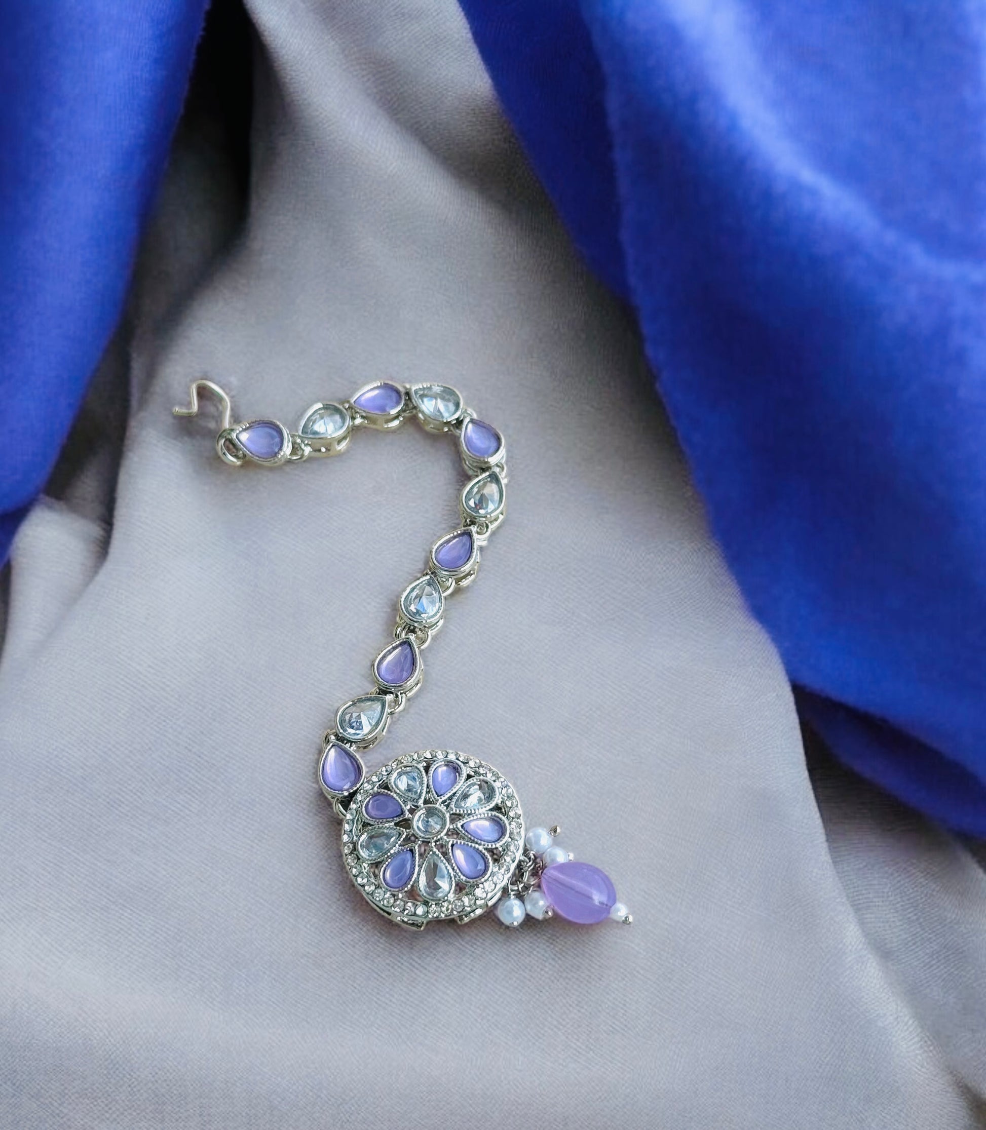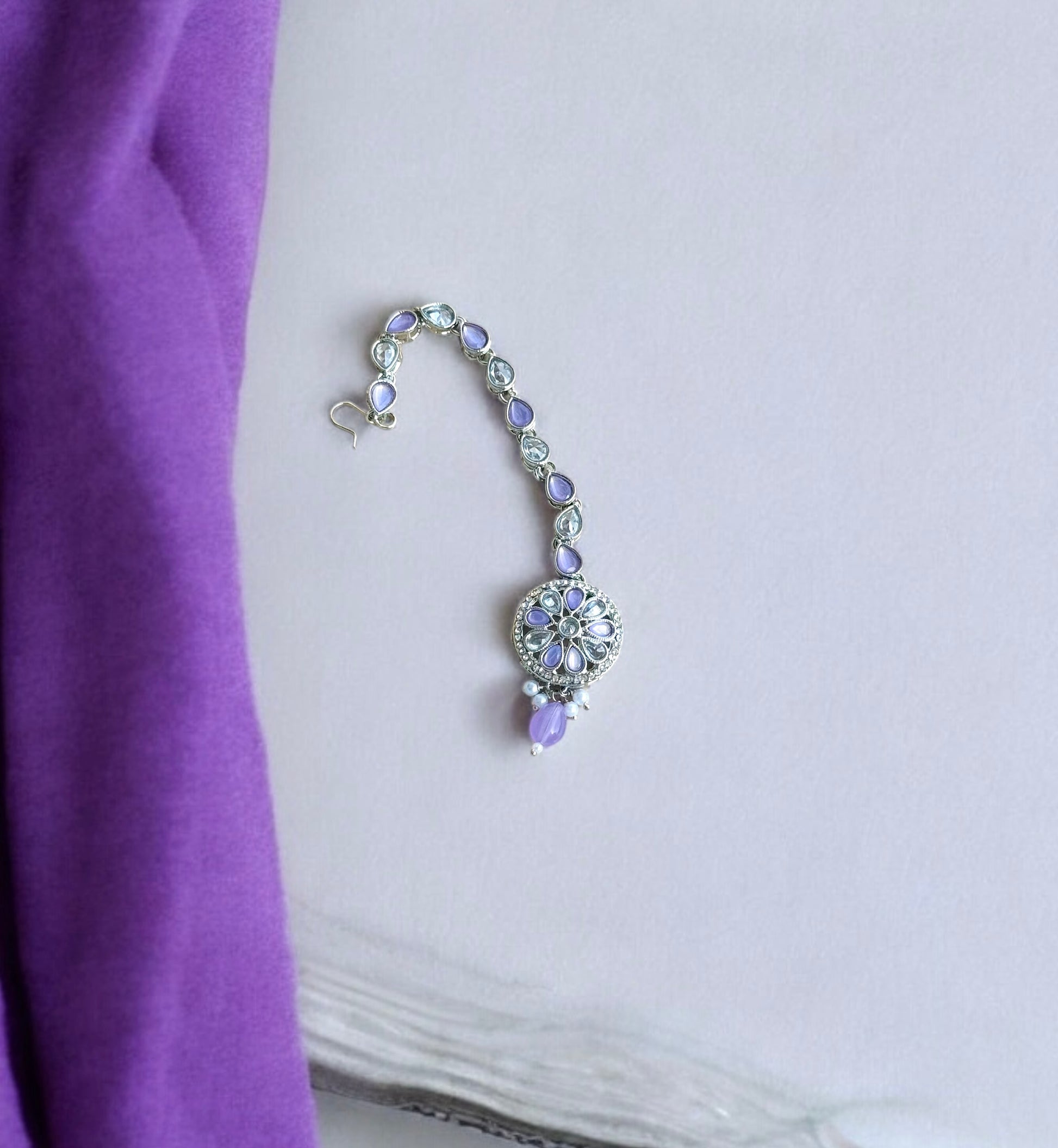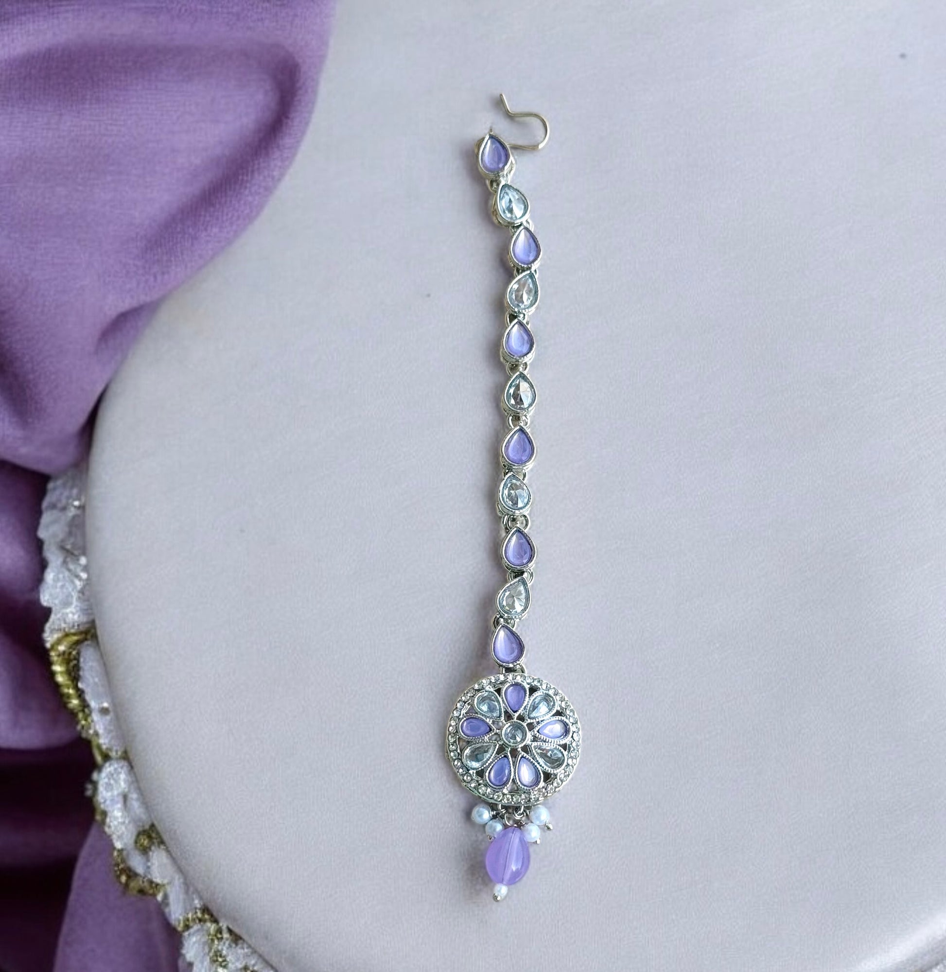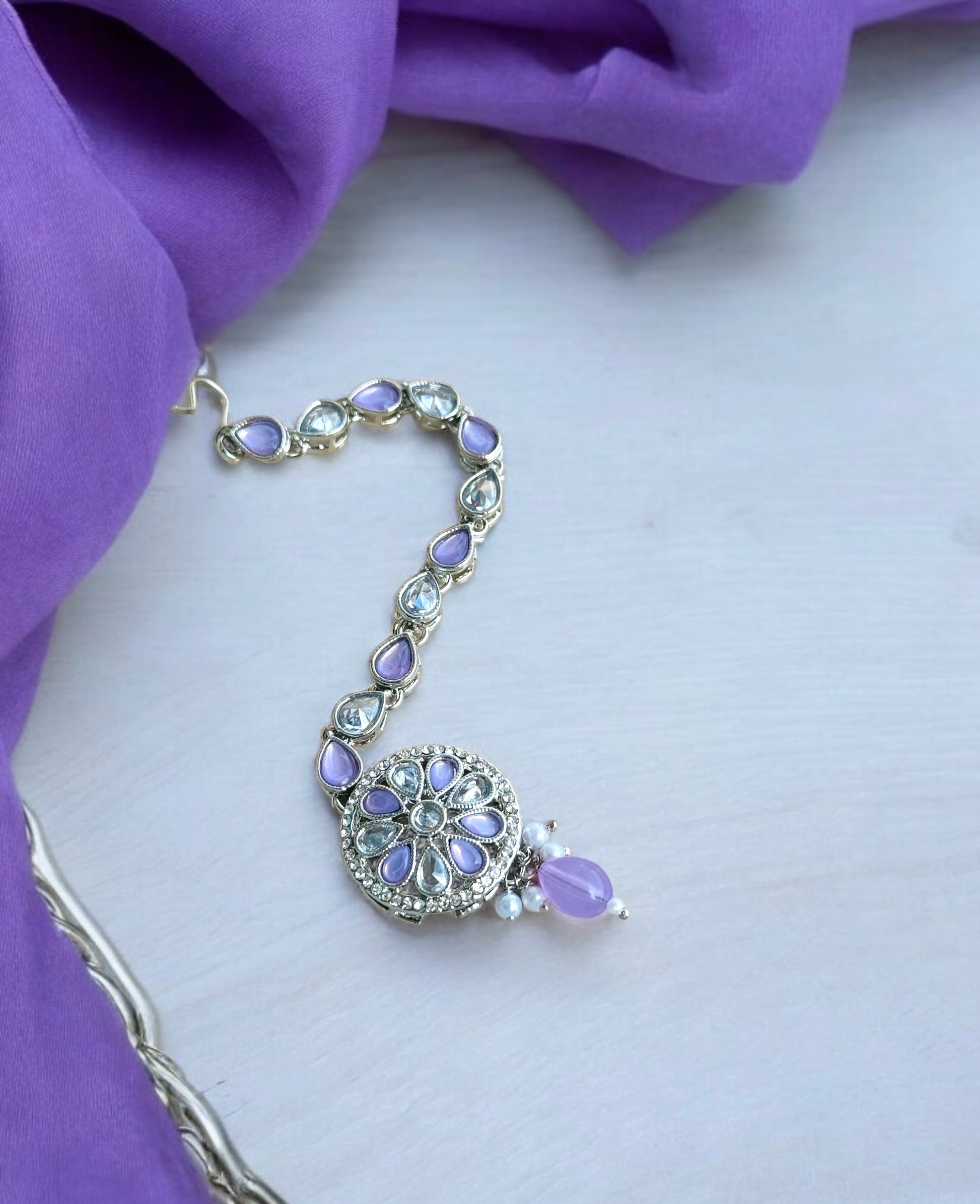 This enchanting Maang Tikka is a dream come true for little Princesses! The delicate chain is adorned with sparkling lavendar gemstones, creating a magical look. The central floral design is embellished with shimmering crystals, adding a touch of glamour and elegance. This Maang Tikka is perfect for dressing up, playing pretend, and feeling like a true fairy princess.
