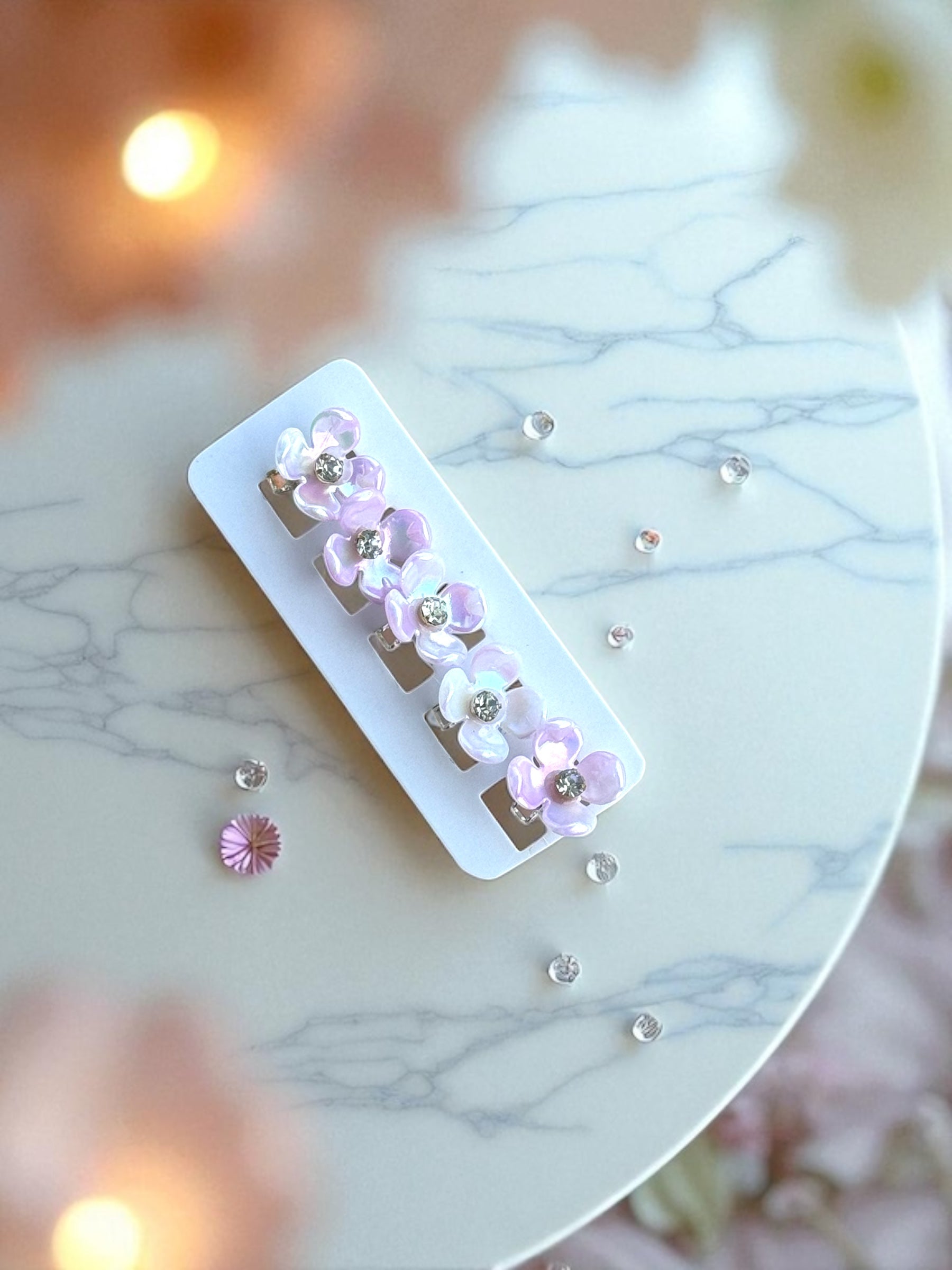 Add a magical, ethereal touch to any hairstyle with the Tiny Coco Opalescent Bloom Snap Clip Set. This beautiful set features four small snap clips, each adorned with a shimmering, iridescent flower that shifts colors in the light. A sparkling faux crystal is nestled in the center of each blossom for extra brilliance. Perfect for securing small sections of hair or decorating pigtails, these gentle clips are the ideal accessory for a delicate, enchanting look.