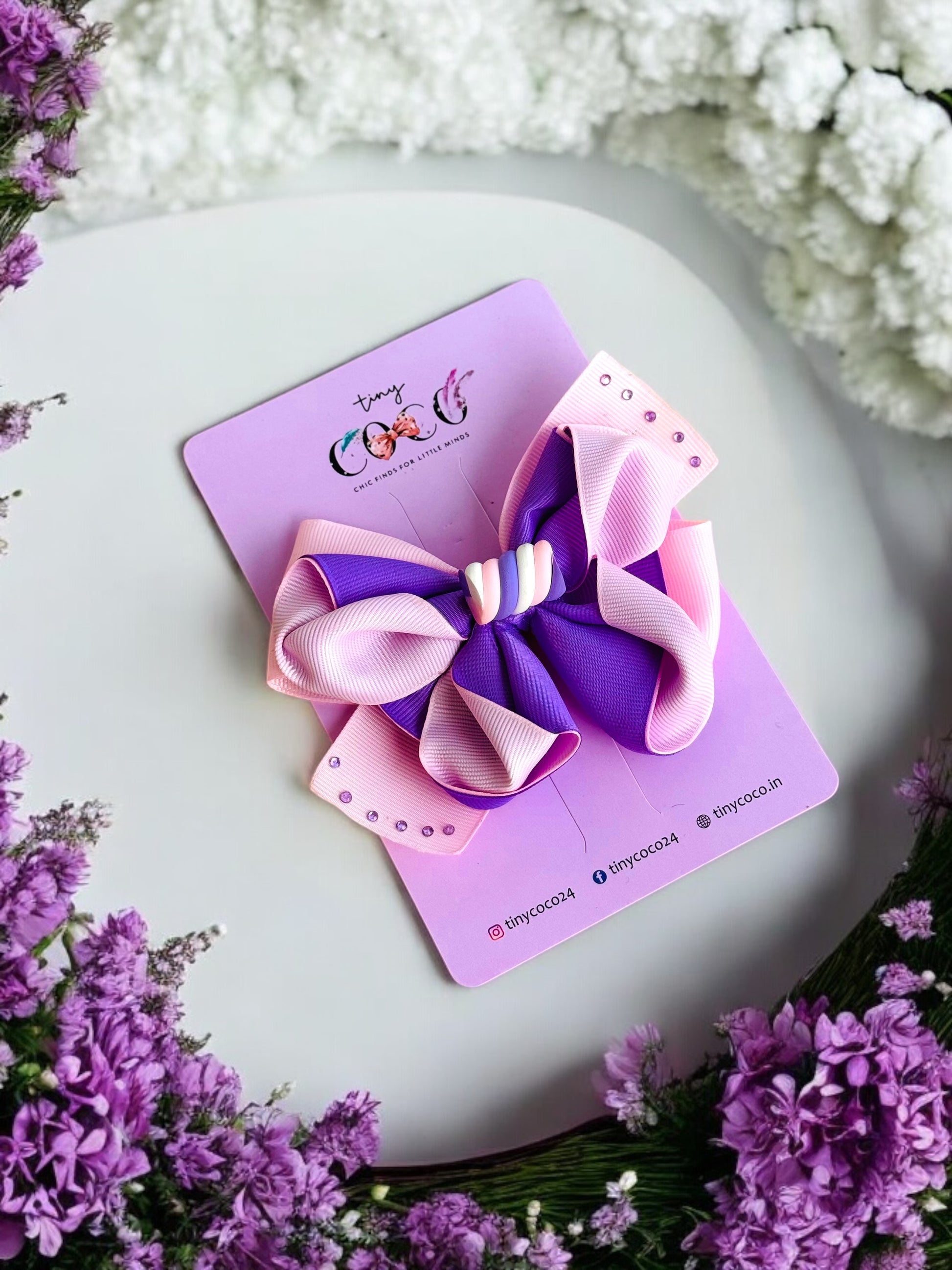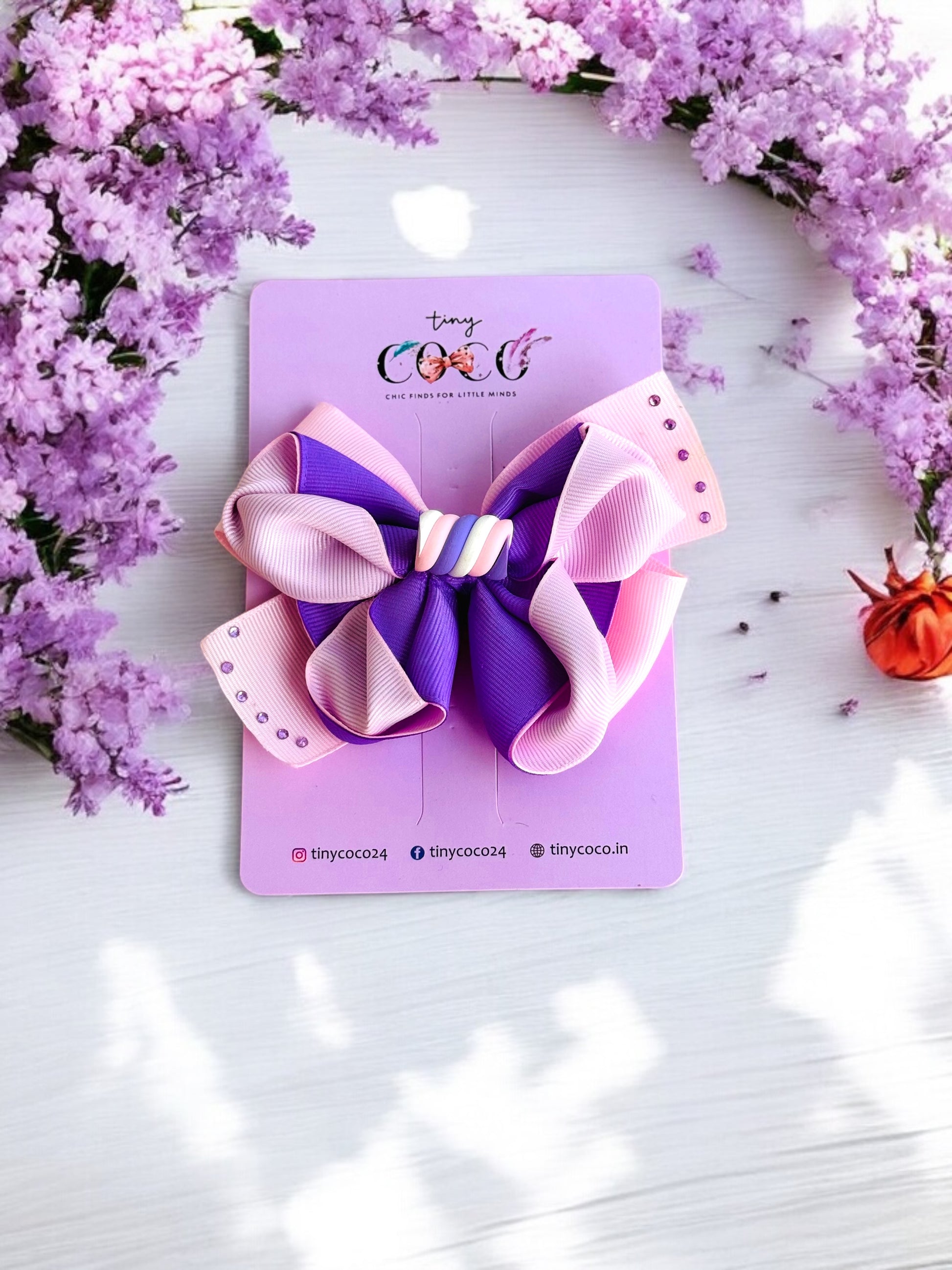 This stunning hair clip features a beautiful bow in soft shades of purple and pink, accented with sparkling rhinestones. Add a pop of color to your little one's hair with this fun and flirty hair clip!