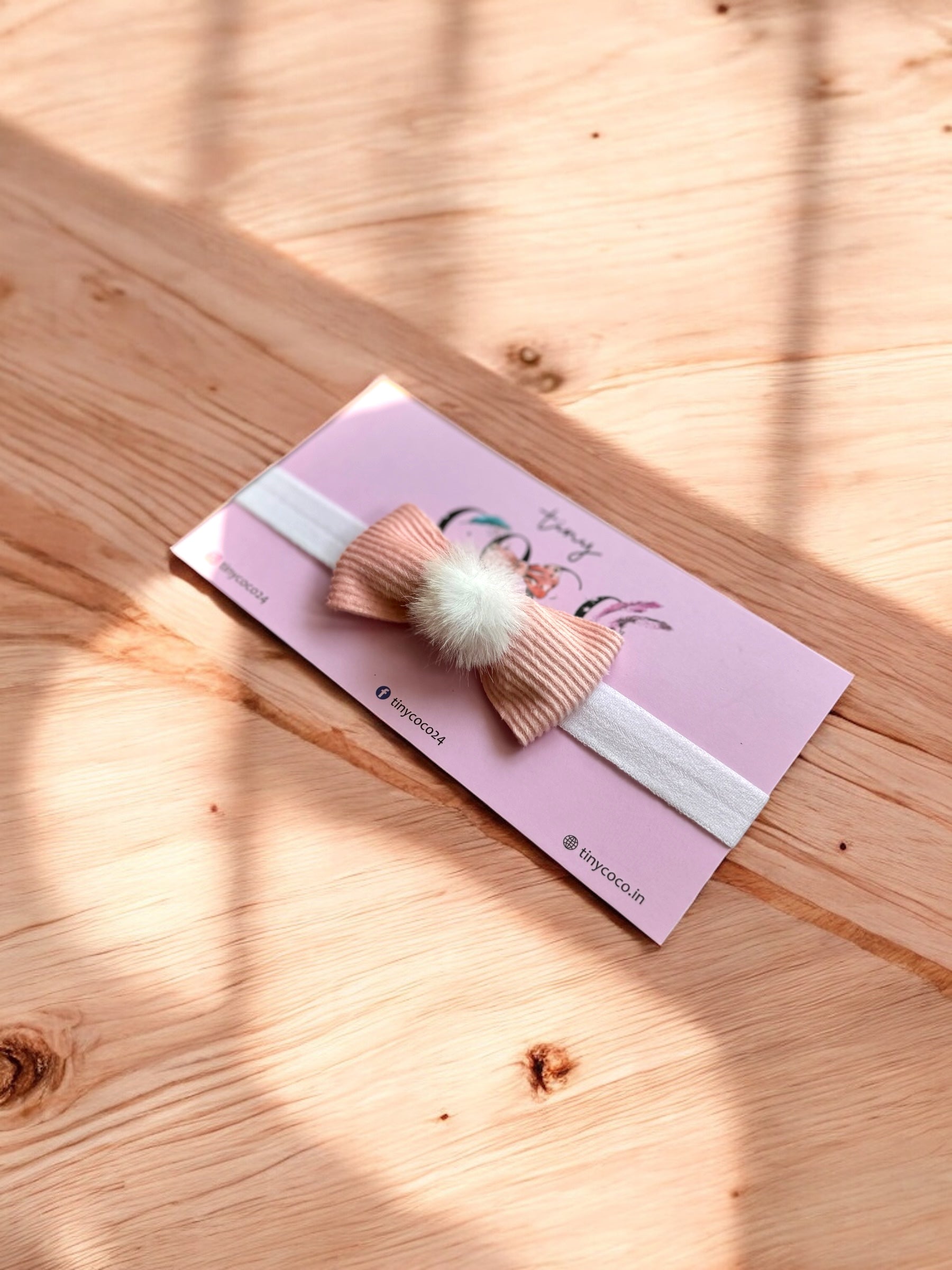 This charming headband features a beautifully crafted bow made from a soft, finely ribbed fabric, creating a lovely subtle texture that adds depth and warmth. Nestled perfectly in the center of the bow is a fluffy, soft white pom-pom, creating an utterly charming and playful focal point that's sure to melt hearts. The bow and pom-pom are securely attached to a comfortable, stretchy light pink elastic band, ensuring a gentle yet firm fit for delicate heads, suitable for infants, toddlers, and young children.