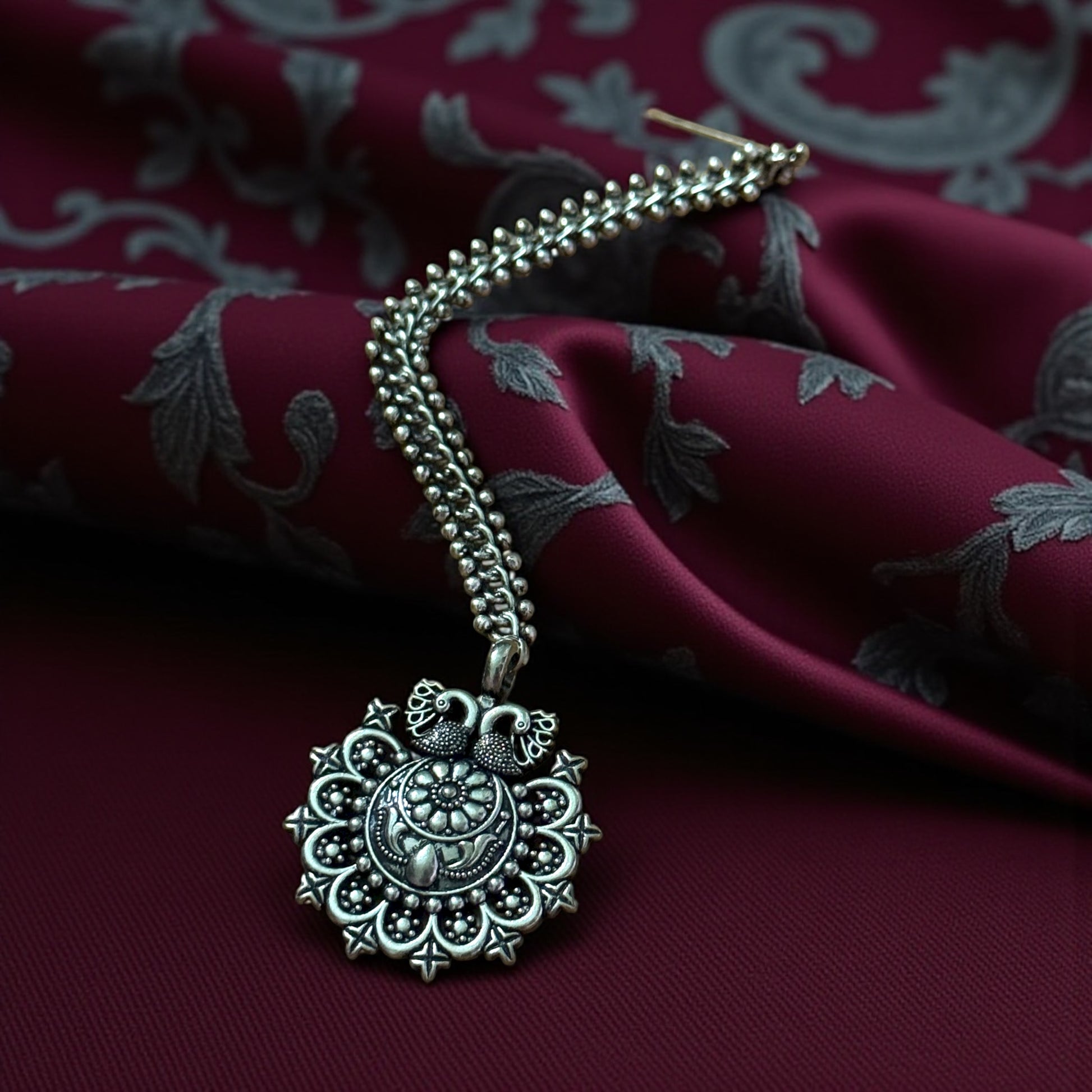 Embrace vintage charm with the Royal Peacock Oxidized Maang Tikka. This stunning headpiece features a medallion intricately detailed with traditional floral motifs and crowned by a beautiful pair of sculpted peacocks. The dark silver oxidized finish gives it an antique, rustic look that pairs perfectly with traditional silver jewelry or contrasts beautifully with vibrant silks. The elegant chain drapes gracefully, making this the ideal statement piece for festive events and special cultural occasions. It's light as a feather.