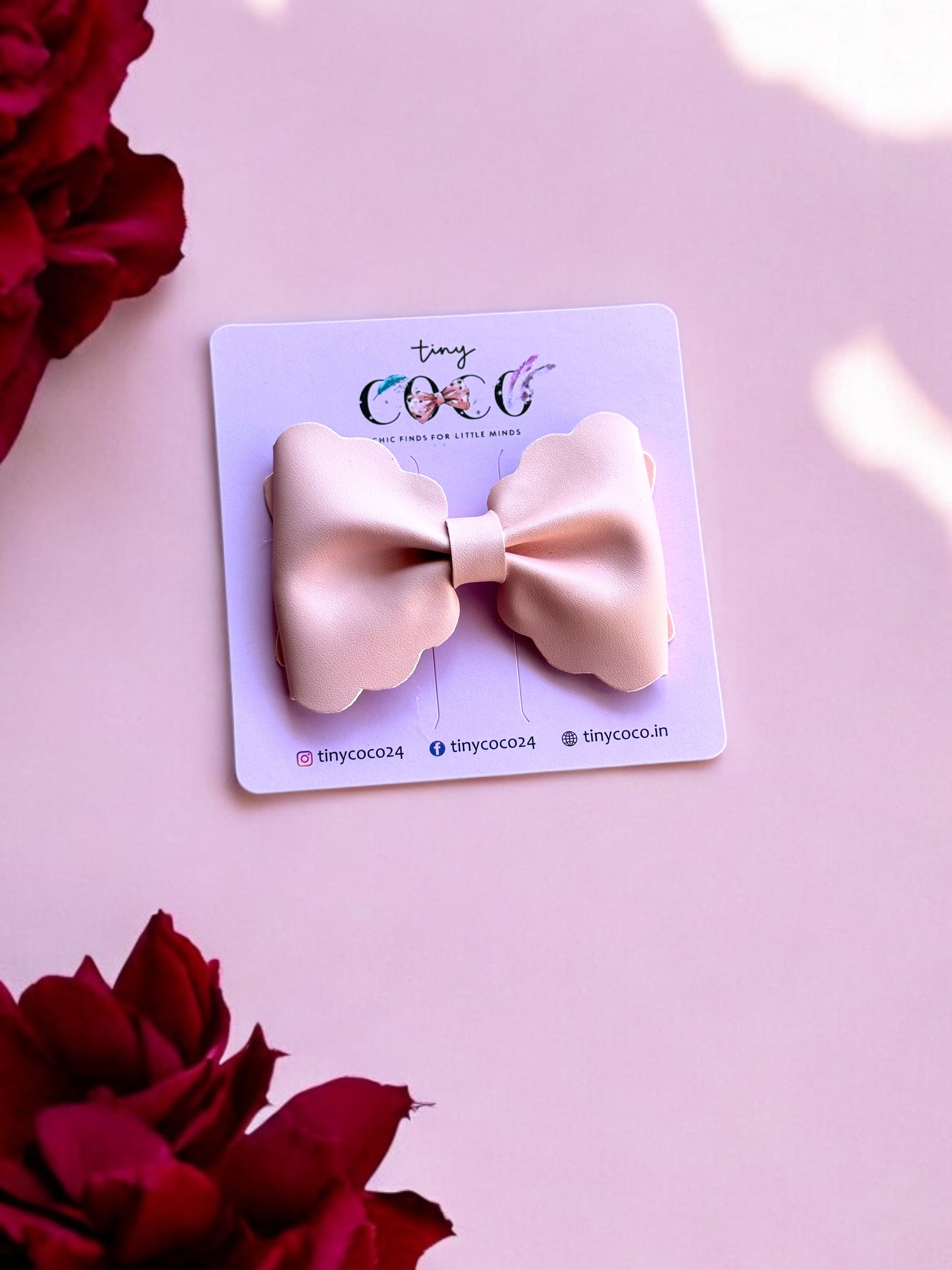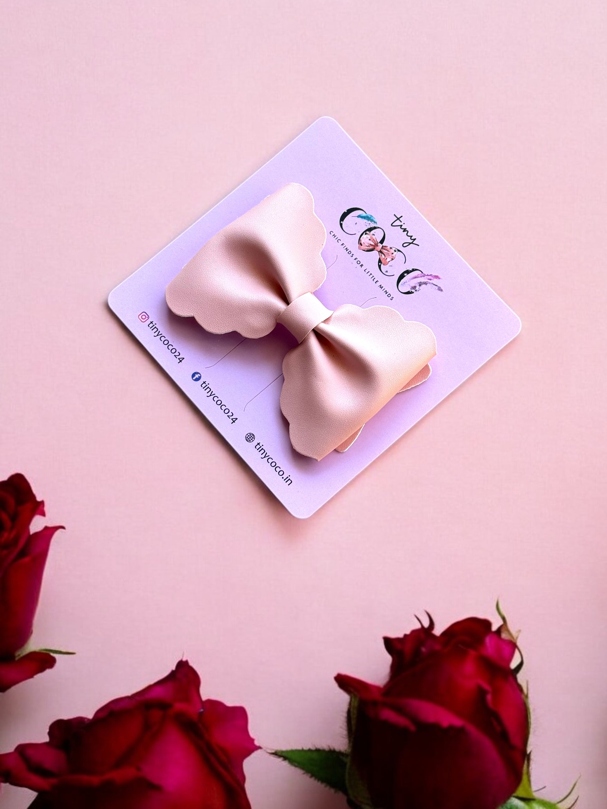 Sweetheart Scallop Bow: This "Sweetheart" Scallop Bow is perfect for adding a touch of sweetness to your little one's hairstyle. The unique scalloped edge and soft color make it a truly charming accessory. Shop now and give your baby a Valentine's Day treat they'll adore!
