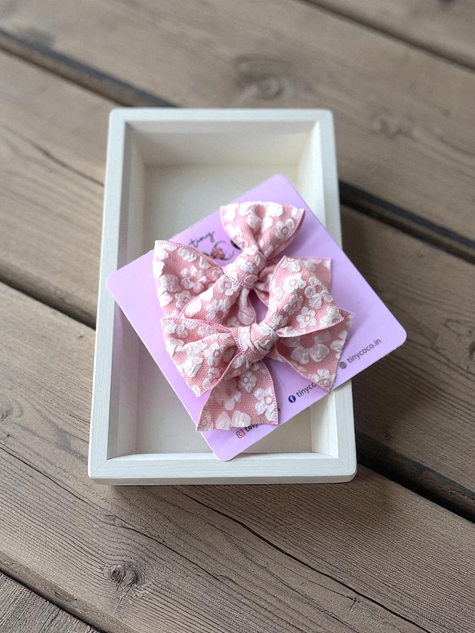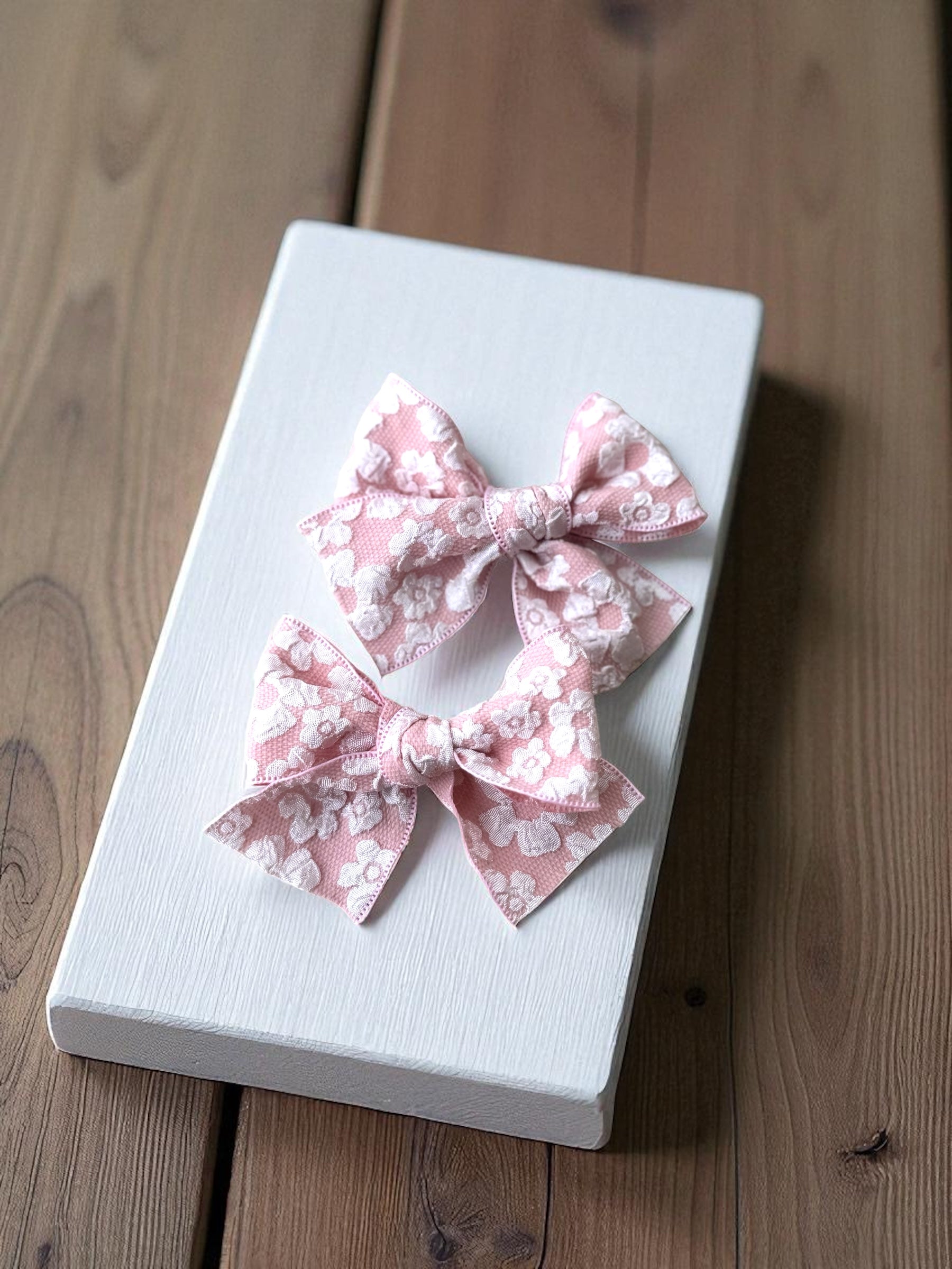 Our Little Darling Bows are the perfect way to add a sweet finishing touch to your child's look. The bows are made from a beautifully textured fabric that features an elegant white floral pattern over a light pink base. Designed to be both stylish and secure, these bows are an ideal accessory for pigtails, ponytails, or braids, ensuring your little one feels like a true darling.