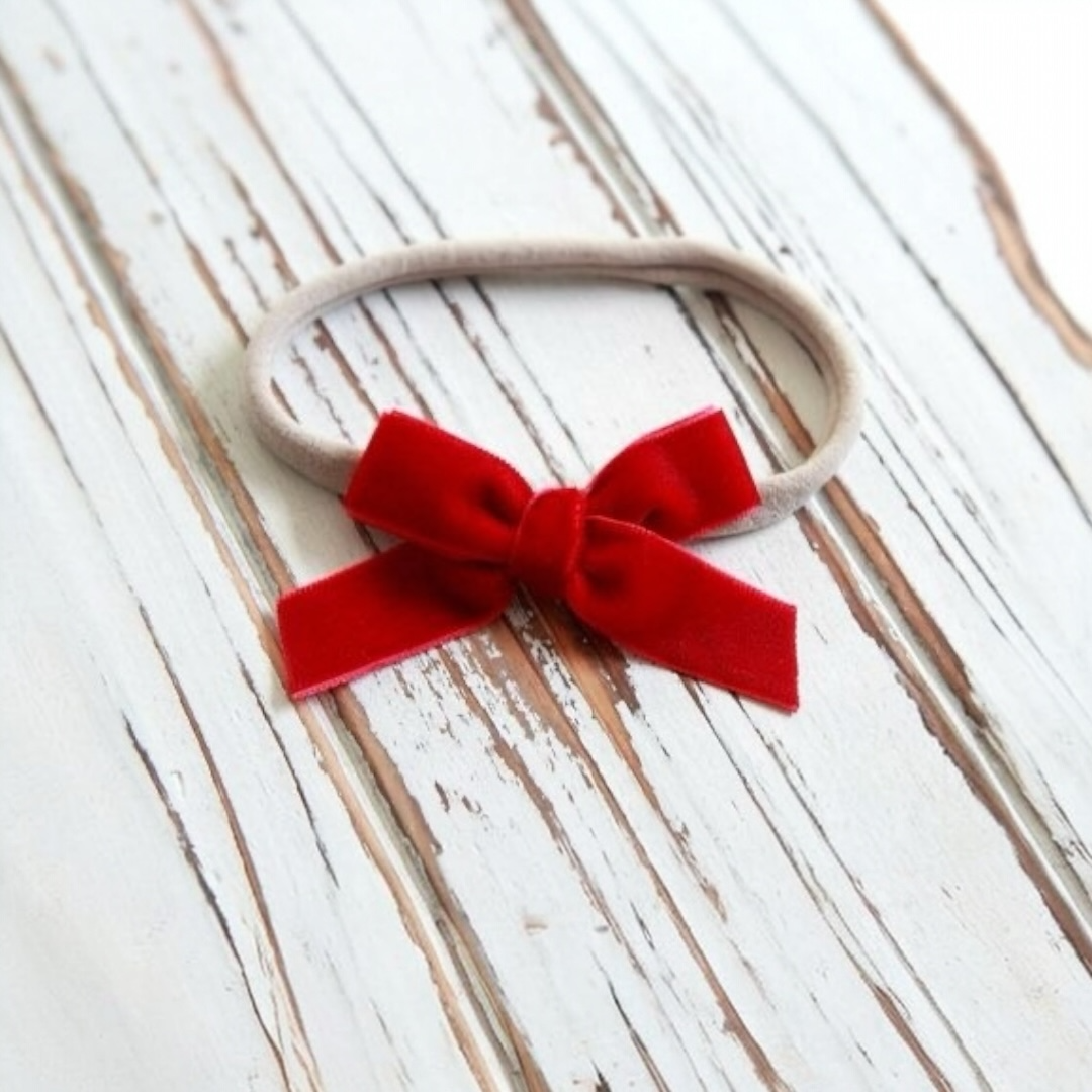 Introduce your little one to holiday luxury with this soft and sweet headband! It features a delicate, handcrafted bow made from plush, vibrant red velvet. The bow is securely attached to an ultra-soft, thin nude/tan nylon elastic band, which is designed to be gentle and comfortable for newborns and infants without leaving marks. It is the perfect subtle accessory for baby's first Christmas photos, holiday parties, or adding a classic festive touch to everyday outfits.